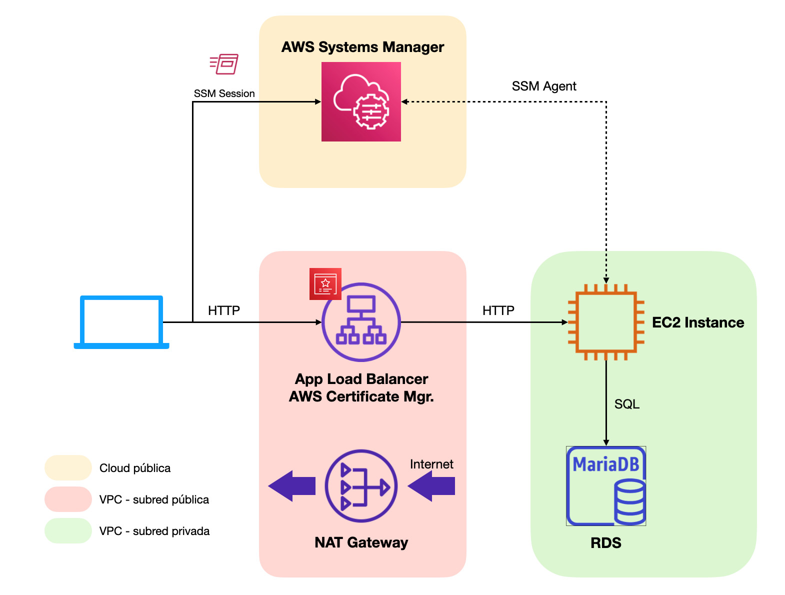 A medida que nuestro sitio web crezca en popularidad, se volverá más propenso a recibir ataques por parte de terceros que intenten extraer información privilegiada o incluso tomar el control de nuestro servidor para hacer un uso malicioso del mismo.Dado que la arquitectura en este punto aún no dispone de redes privadas, todos los componentes disponen de IPs públicas y, si por un descuido o una mala praxis a la hora de gestionar las reglas de grupos de seguridad algún puerto sensible queda abierto al exterior (TCP22 para el servicio SSH de nuestro servidor web o TCP3306 para la base de datos RDS), estos quedarían disponibles para que cualquier atacante “pruebe suerte” directamente conectándose a dichos servicios de alta sensibilidad.Una de las mayores recomendaciones que se puede hacer a la hora de securizar cualquier infraestructura de servidores es la implementación de redes privadas únicamente accesibles mediante servicios de seguridad de propósito específico tales como VPNs, instancias Bastion o, como en el caso que veremos a continuación, AWS Systems Manager.
