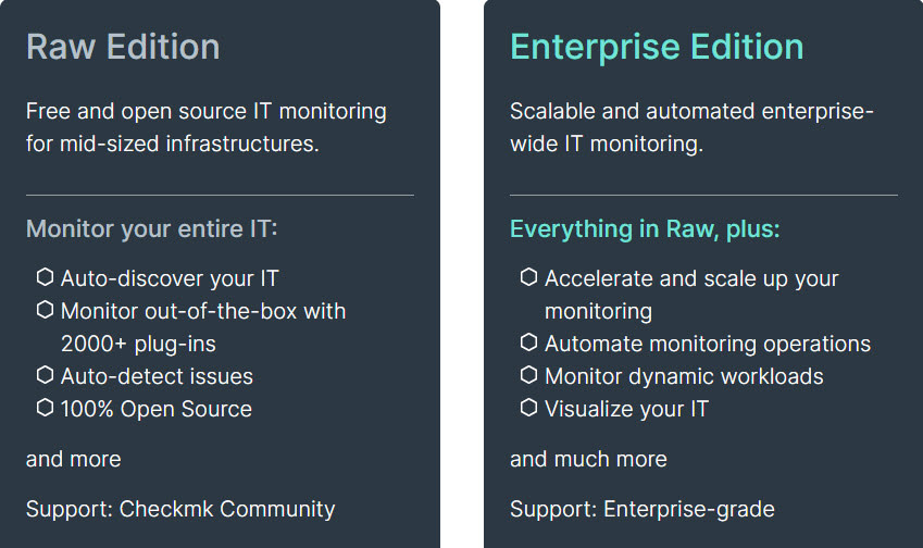 - Funcionalidad avanzada: ofrece funcionalidades avanzadas y características adicionales que no están disponibles en la versión Raw Edition, como descubrimiento automático de servicios, monitorización de aplicaciones específicas, monitorización de bases de datos, monitorización de la nube, integraciones con herramientas de gestión y automatización, entre otros.