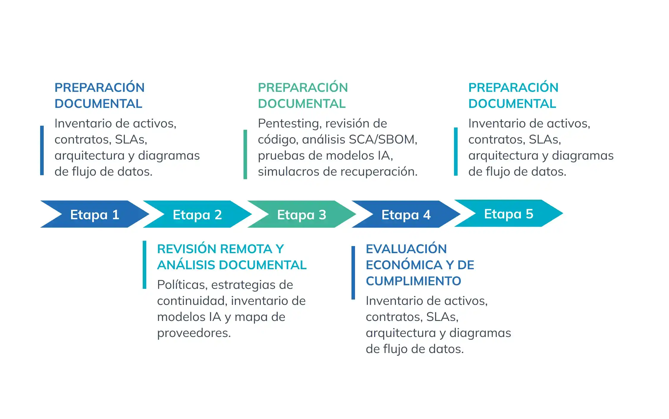 - Informe ejecutivo y scorecard técnico: mapa de riesgos con scoring por dominio (seguridad, IA, datos, arquitectura, coste).
